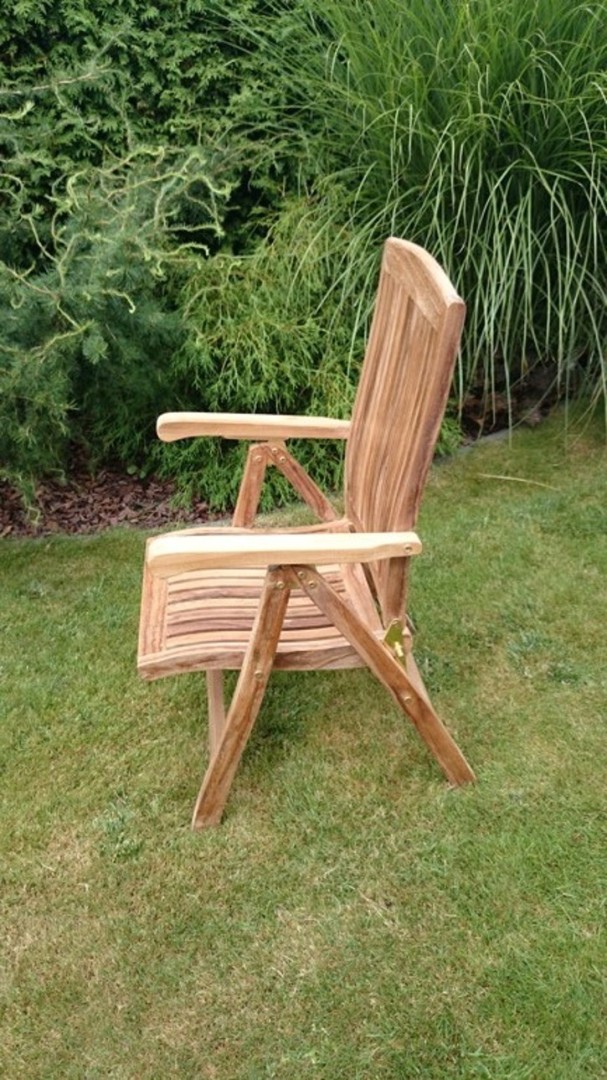 Polohovací dřevěná zahradní židle z vysoce odolného materiálu teak. Anatomicky tvarovaná. Široké područky pro pohodlné sezení a rychlá možnost složení židle pro potřebu uložení. Opěrku zahradní židle America si můžete podle potřeby nastavit až do 5 poloh. Před vlivem počasí doporučujeme ošetřit teakovým olejem. Ochráníte tím materiál židle a zároveň nádherně vynikne struktura teakového dřeva.