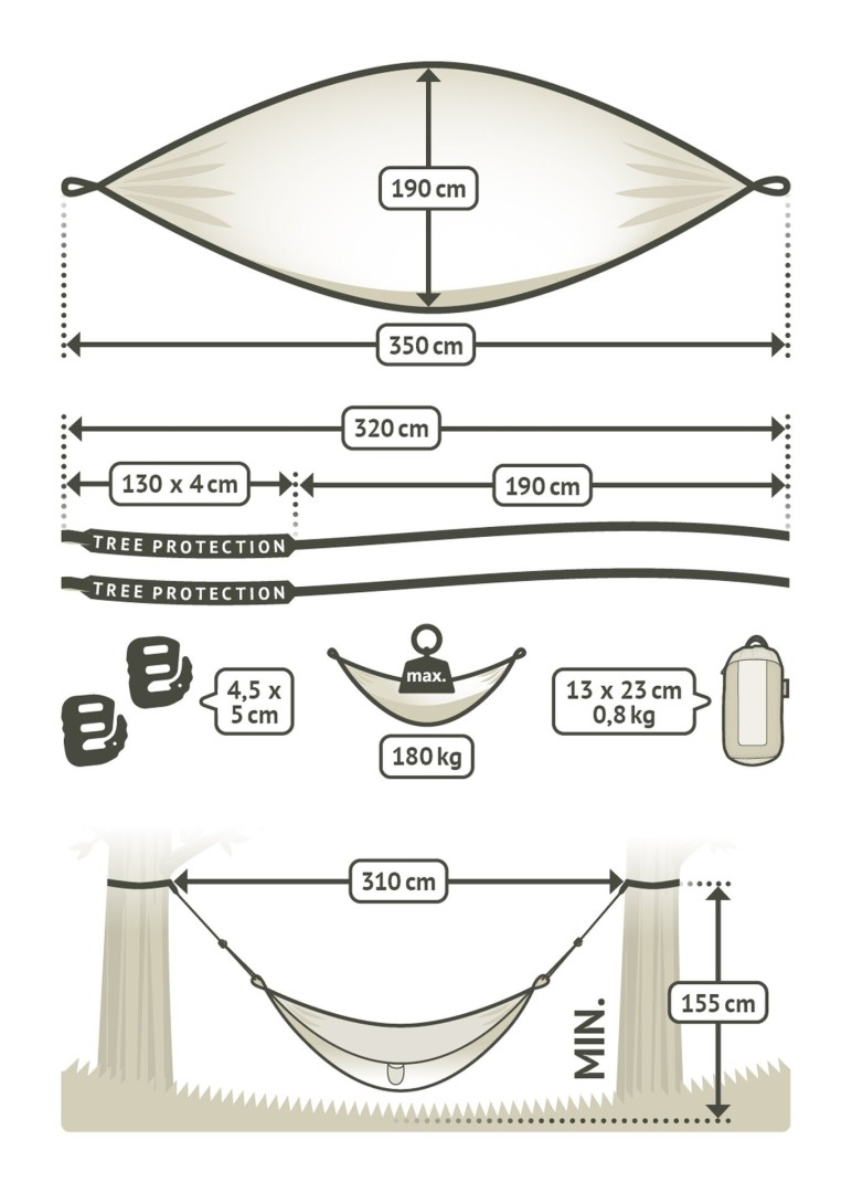 Celková hmotnosť hamaky s popruhmi je 0,8 kg, takže ju ľahko zbalíte do batohu. Využiť ju ale môžete aj ako plážovú deku či tienidlo proti slnku.