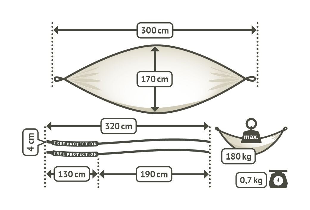 Celková hmotnosť hamaky s popruhmi je 0,7 kg, takže ju ľahko zbalíte do batohu. Využiť ju ale môžete aj ako plážovú deku či tienidlo proti slnku.
