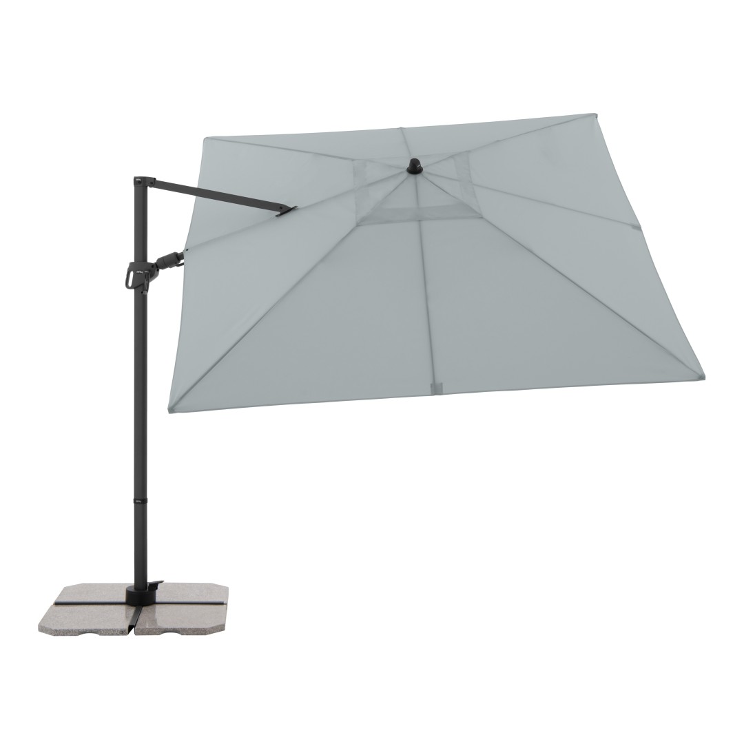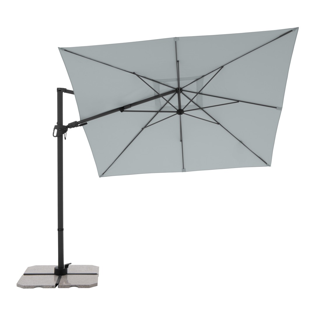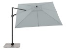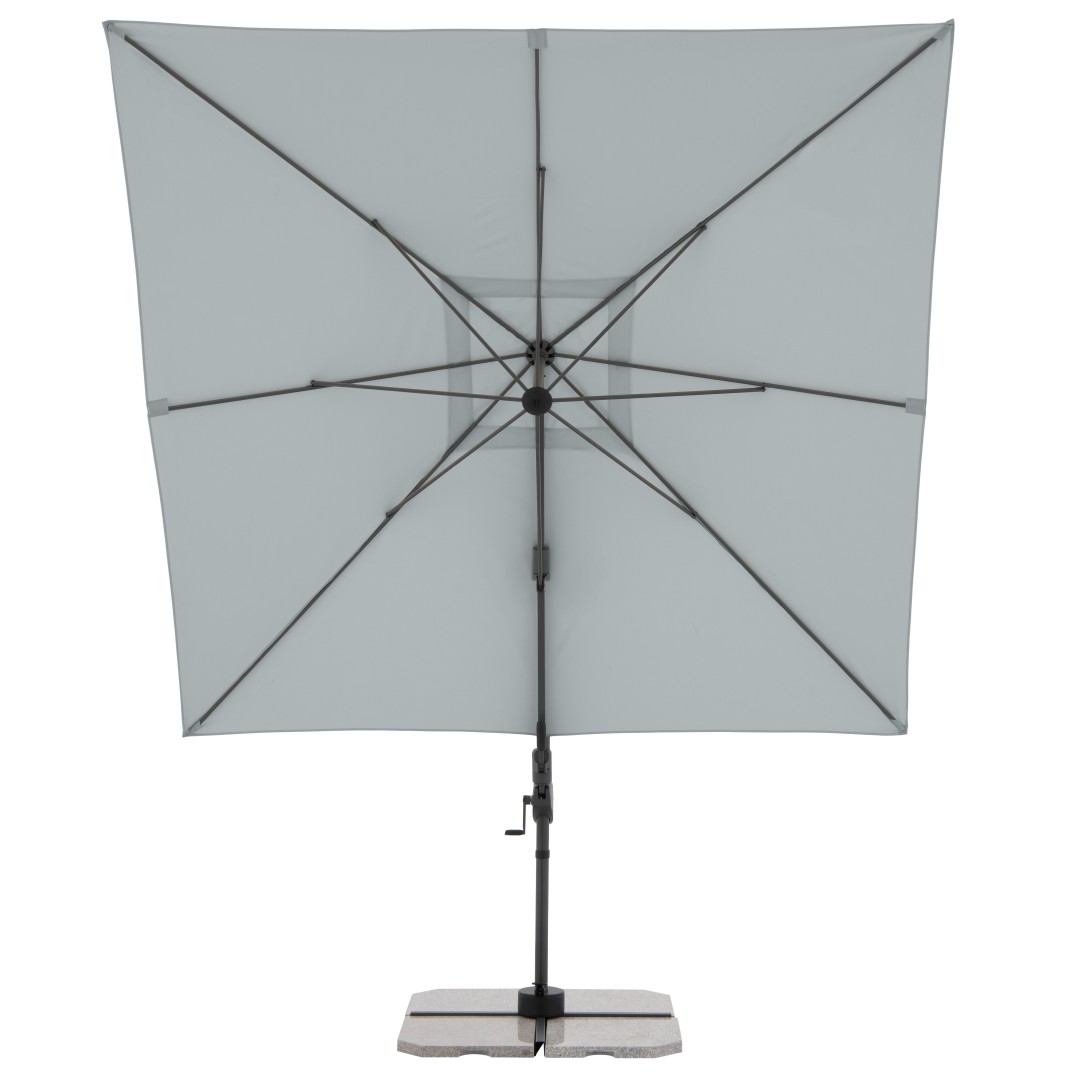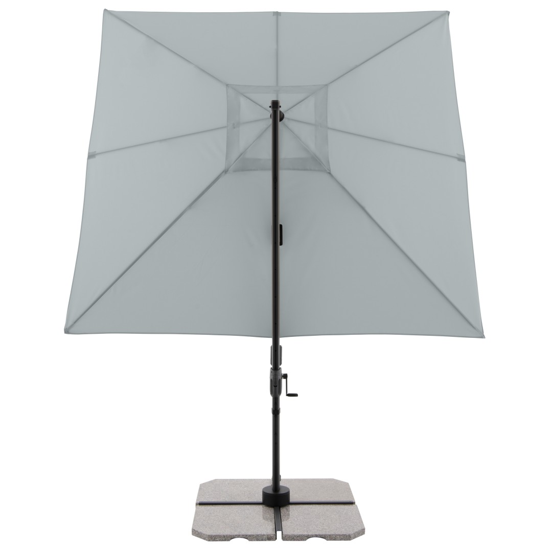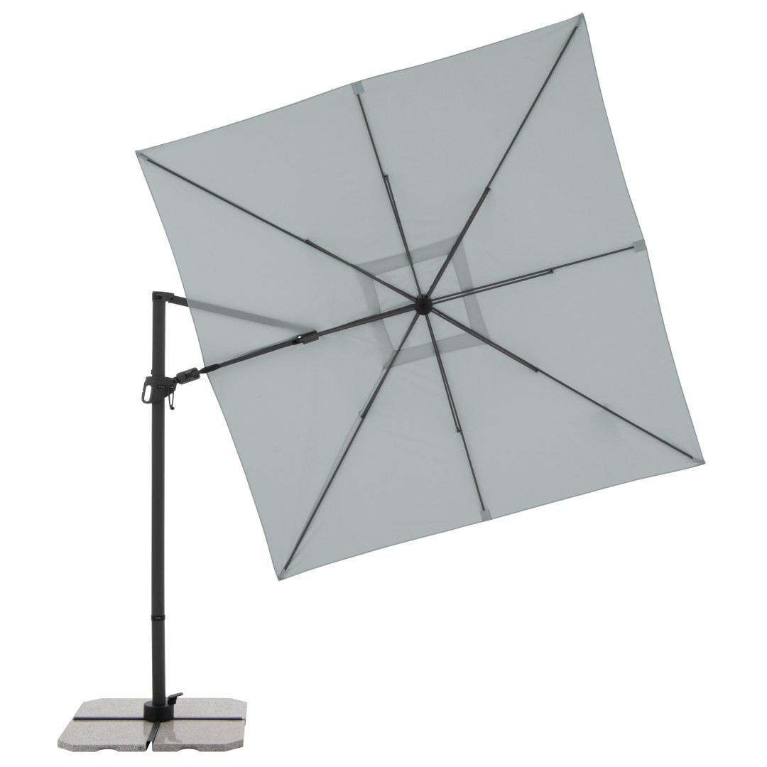 Slunečník má stabilní hliníkovou konstrukci, je vybaven klikovým mechanismem a je snadno ovladatelný. Potah slunečníku je vyroben z polyesterové tkaniny, je vodoodpudivý a má dobrou UV ochranu SPF 50+. Slunečník je otočný o 360°, je možné ho naklápět v sedmi pozicích a axiálně natáčet na obě strany.
