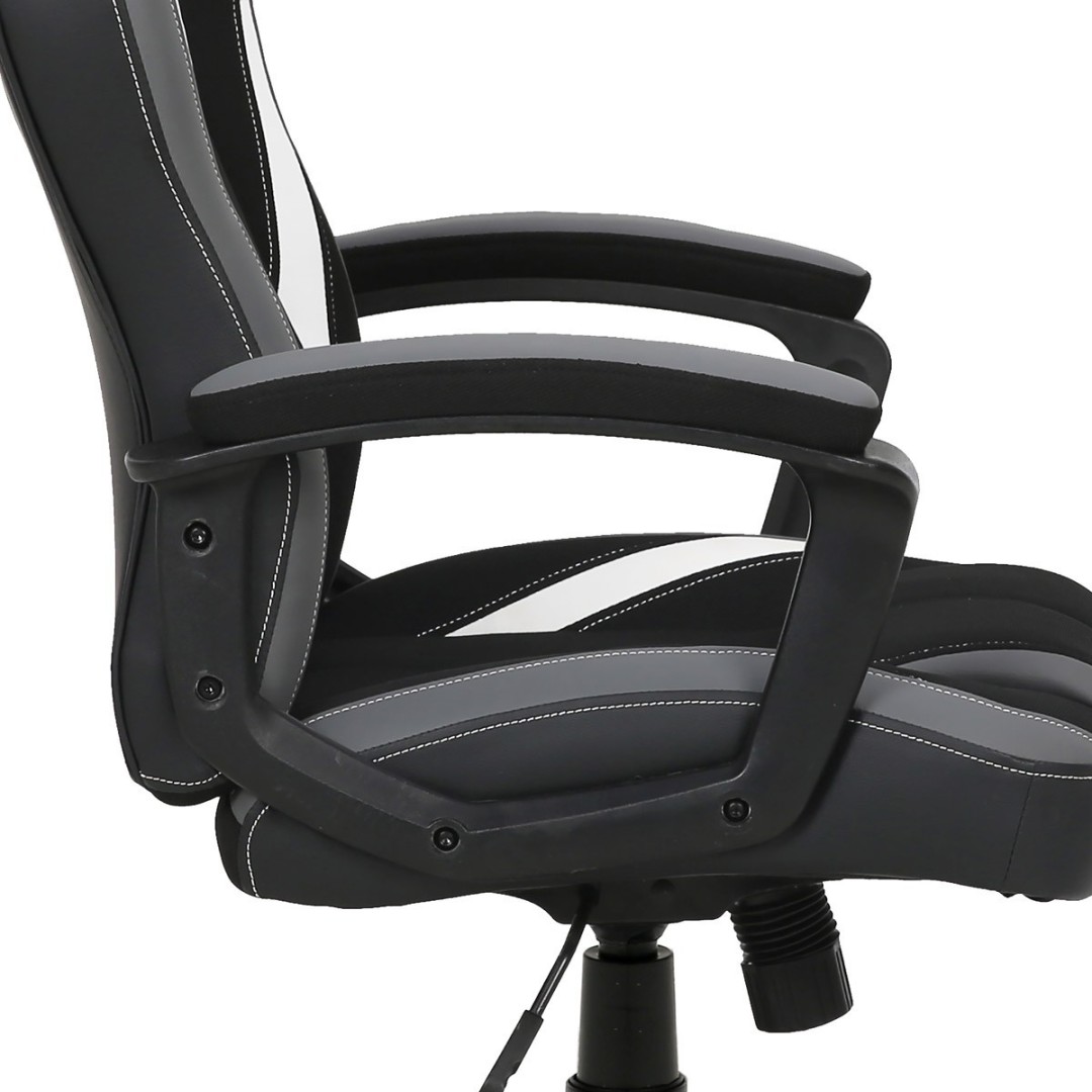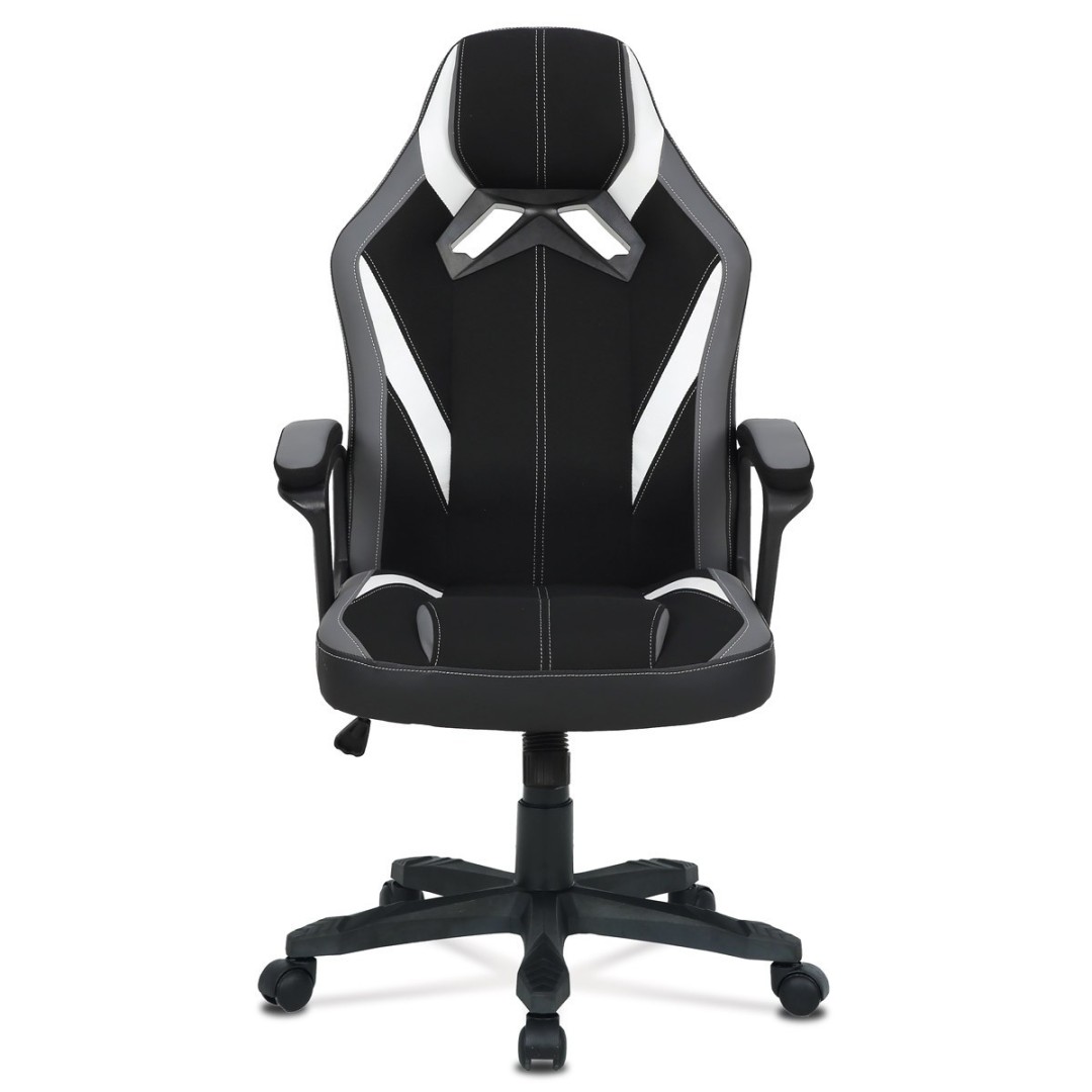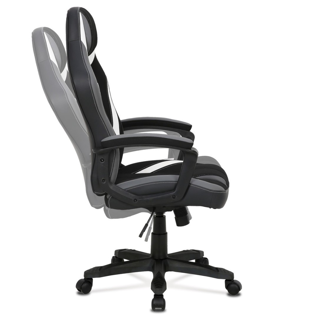 Poťah je kombináciou čiernej a šedej látky a bielej ekokože, s decentným bielym prešívaním celého kresla. Kostra je z oceľových ohýbaných rúrok. Masívne polstrovanie sedadla aj operadla z kvalitnej PU peny je zárukou pohodlného posedenia pri herných večeroch. Ruky si môžete pohodlne položiť na pevné plastové podrúčky, opierky sú tiež polstrované a potiahnuté čiernou a šedou látkou.