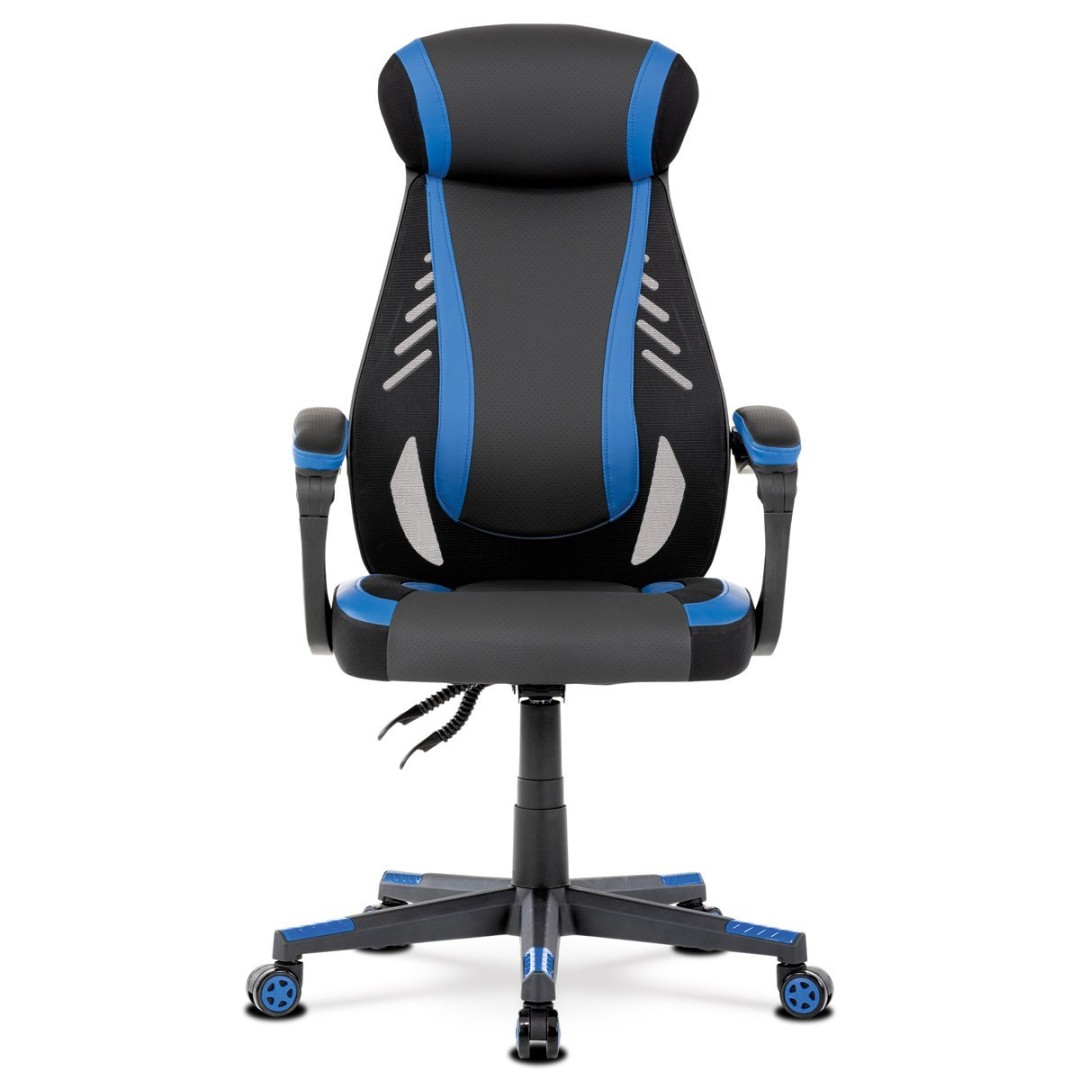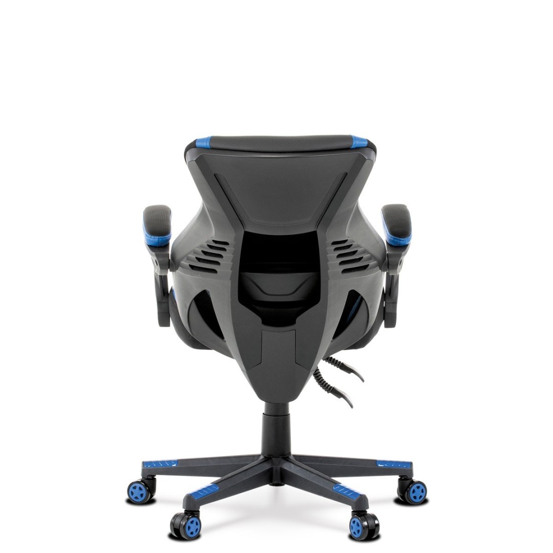 Vysoké, priedušné a ergonomicky navrhnuté operadlo s integrovanou zosilnenou opierkou hlavy, polstrovanou a výškovo nastaviteľnou bedrovou opierkou slúži nielen ako výborná opora celého chrbta a tiež podporuje správne držanie chrbtice. Podrúčky sú plastové, polstrované a potiahnuté modrou a čiernou ekokožou. Šírka je 7 cm, dĺžka ložnej plochy 33 cm a výška 3 cm. Pri sklápaní sedadla sa pohybujú a kopírujú jeho pohyb a polohu.