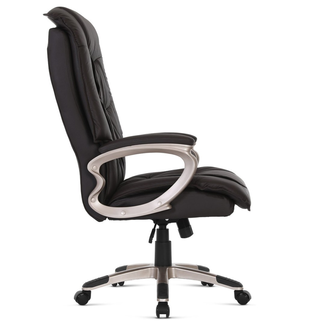 Manažérske kreslo v poťahu z tmavo hnedej ekokože. Vrchná časť podrúčiek je krytá mäkkým madlom v tmavo hnedej ekokoži.