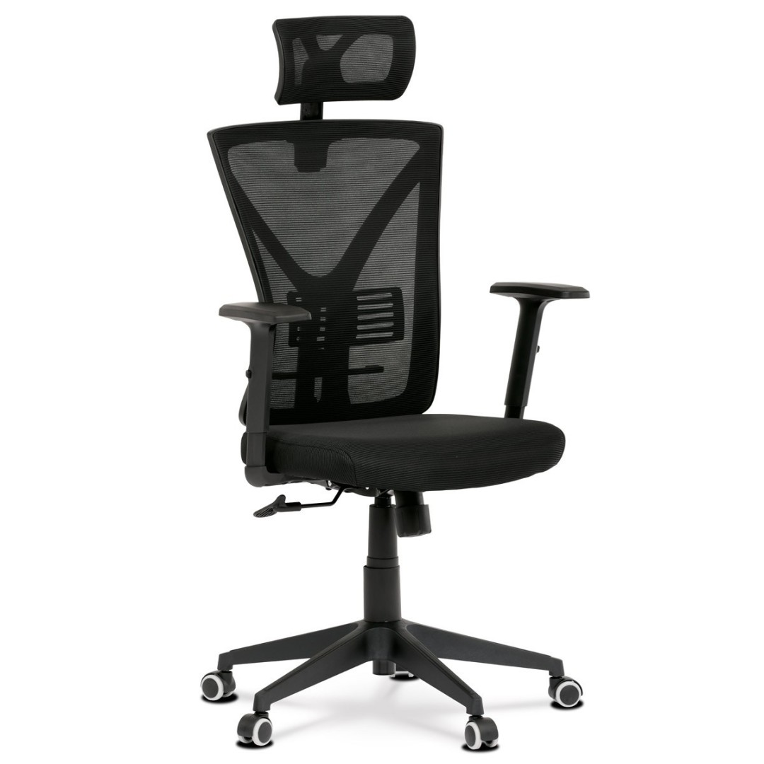 Kancelárska stolička v čiernej látke. Výškovo nastaviteľné podrúčky.