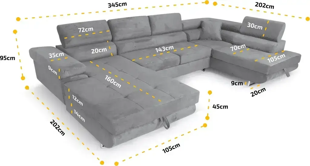- Veľkorysé rozmery: so šířkou 345 cm a hĺbkou 202 cm ponúka pohovka dostatok priestoru pre každého. Určená je pre 8 osôb.