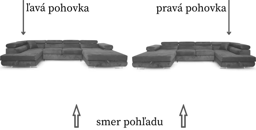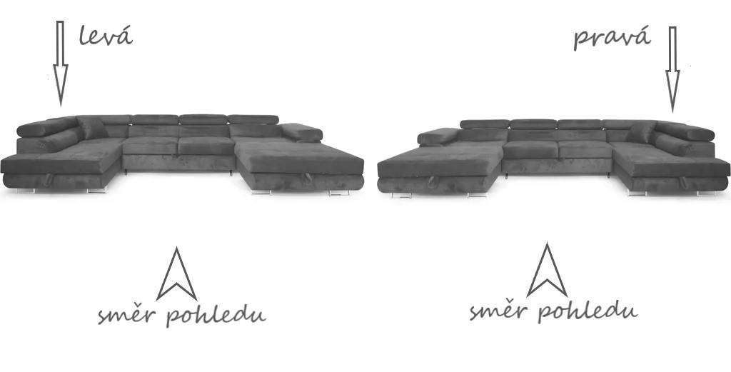 Rohová sedacia súprava Aller U XXL je k dispozícii v ľavej aj pravej verzii. Pre určenie strany sa na pohovku pozrite spredu: pokiaľ je operadlo na pravej strane, jedná sa o pravú pohovku; pokiaľ je na ľavej, jedná sa o ľavú verziu.