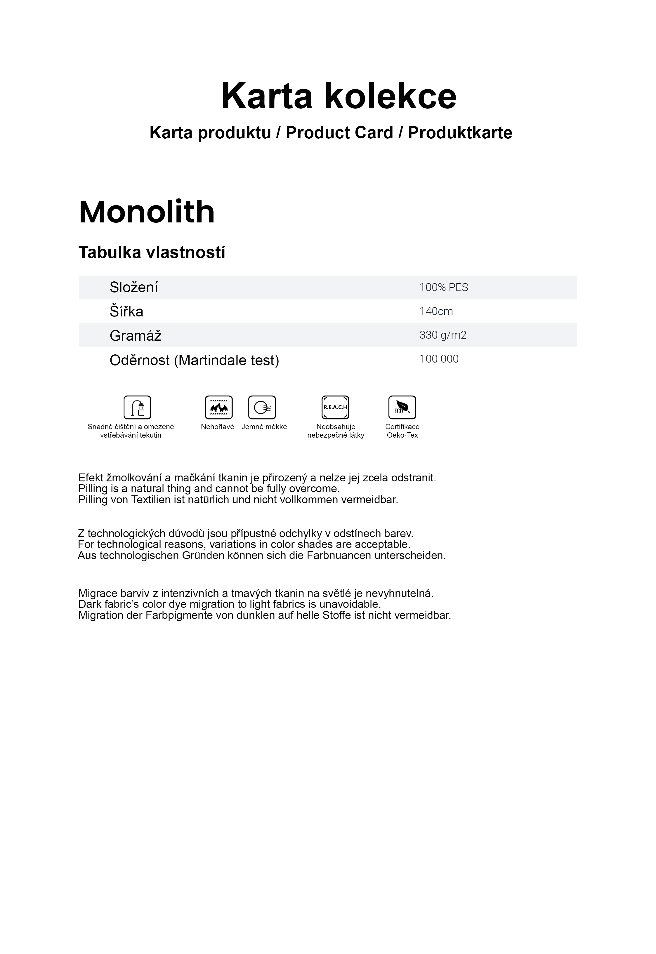 - Poťahová látka MONOLITH: vodu-odpuzujúca, odolná voči oderu, príjemná na dotyk. Ľahko sa čistí pomocou suchéj alebo navlhčenej handričky. Okrem vysokej odosnosti voči oderu je látka Monolith odolná aj voči žmolkovaniu a vyblednutiu. Vďaka príslušným certifikáciám je vhodná aj do verejných priestorov. Karta poťahu.