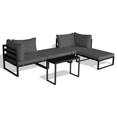 Pevná kovová konštrukcia s práškovou povrchovou úpravou v antracitovej farbe je doplnená pohodlnými tmavo šedými látkovými sedákmi, ktoré sú pevne pripevnené ku konštrukcii pre maximálnu stabilitu. Doska stolíka z tvrdeného skla dodáva zostave elegantný vzhľad, zatiaľ čo moderný design zaručuje štýlový doplnok do vašej záhrady alebo na terasu.