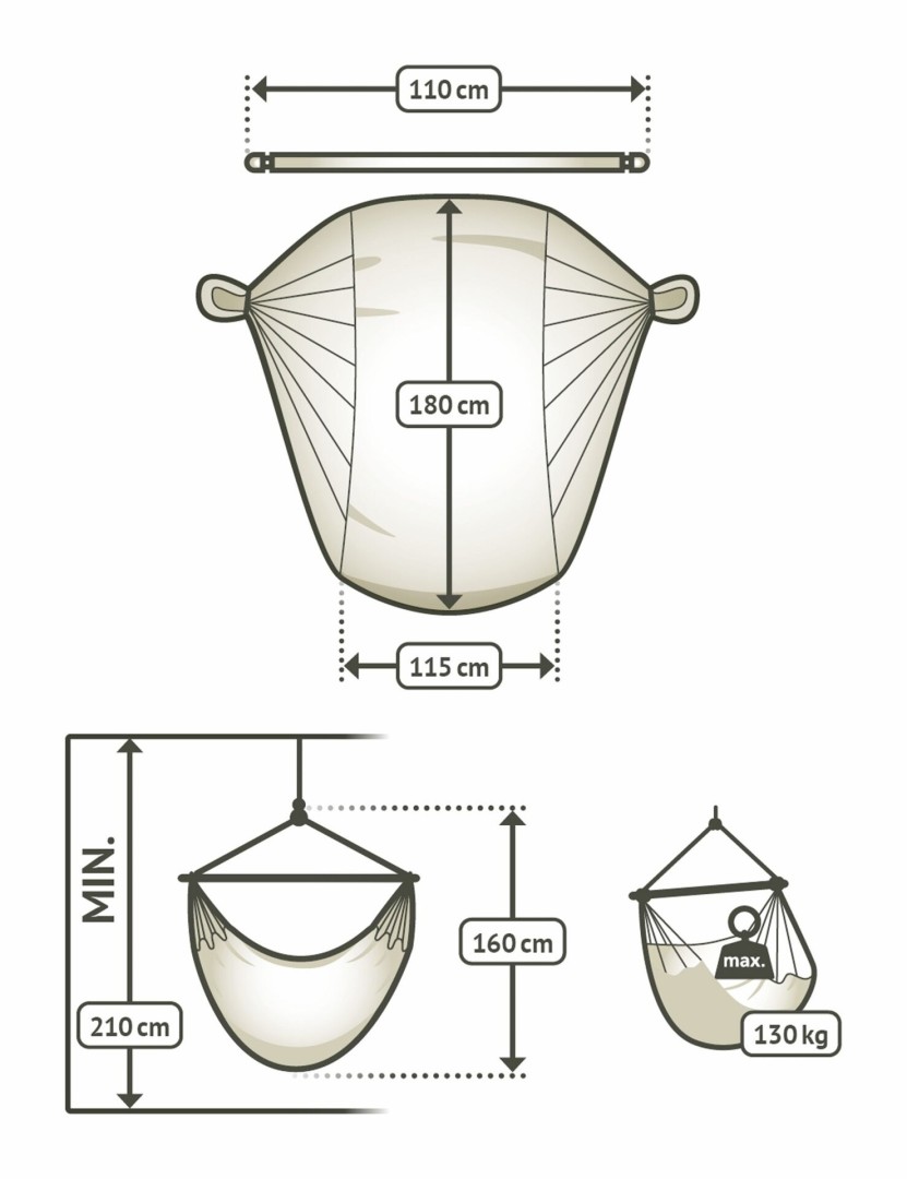 Rozperná tyč je vyrobená z kvalitného bambusu a pochádza z udržateľného lesného hospodárstva. Je dodávaná s integrovaným bezpečnostným čapom z nerezovej ocele, ktorý zaistí hladké otáčanie sedačky do všetkých smerov. Na uchytenie potrebujete len jeden kotviaci bod (trám, strop, pergola či vetva stromu).